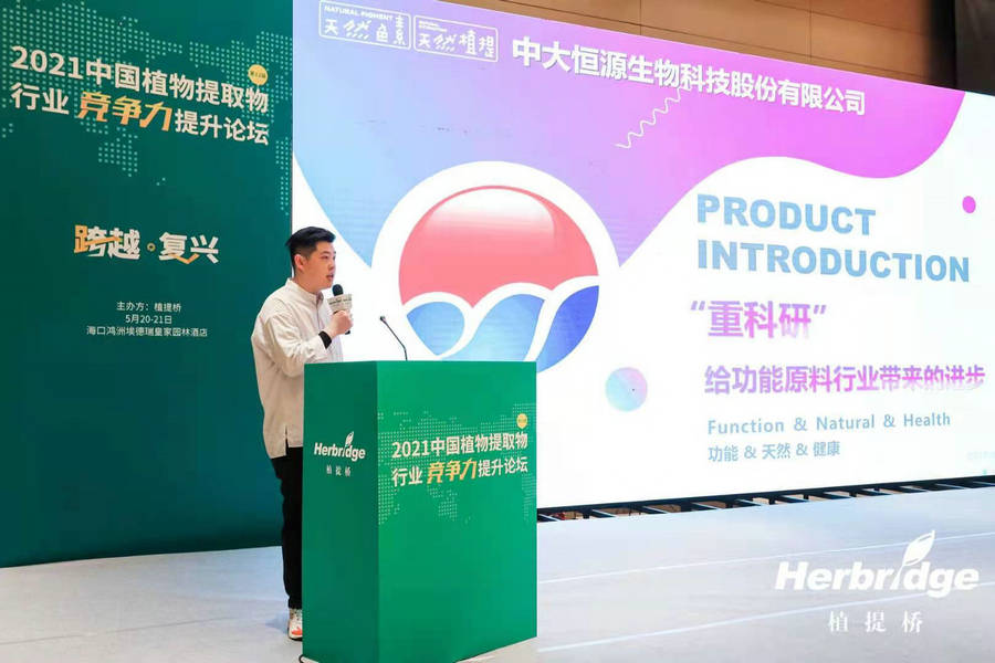 2021年5月20-21日第12屆中國植物提取物行業(yè)競爭力提升論壇在海口市舉行,河南中大恒源生物科技股份有限公司銷售總經(jīng)理金子恒應邀參會,并在論壇作了《“重科技”給功能原料行業(yè)帶來的進步》主題演講,引發(fā)與會人員的廣泛關(guān)注。